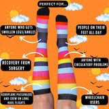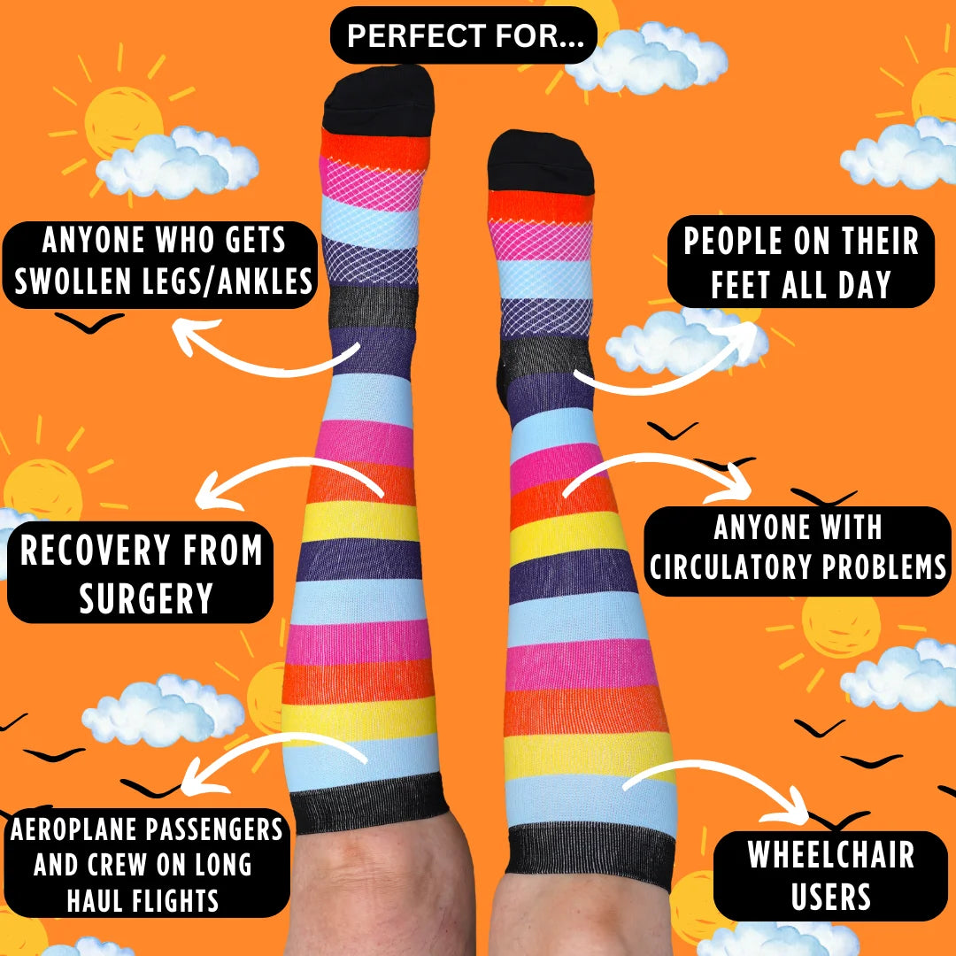 Funky Sock Co Compression Socks are designed for comfort and ease. Featuring two different graduated compression ranges - Classic (20-30mmHg) and Bamboo (12-15mmHg) with sizing up to 7XL in our Classic Range. Our socks provide reliable support to keep your legs feeling energized and comfortable all day.