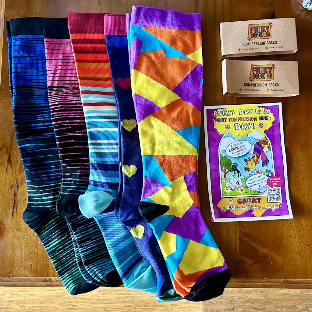 Funky Sock Co Compression Socks are designed for comfort and ease. Featuring two different graduated compression ranges - Classic (20-30mmHg) and Bamboo (12-15mmHg) with sizing up to 7XL in our Classic Range. Our socks provide reliable support to keep your legs feeling energized and comfortable all day.