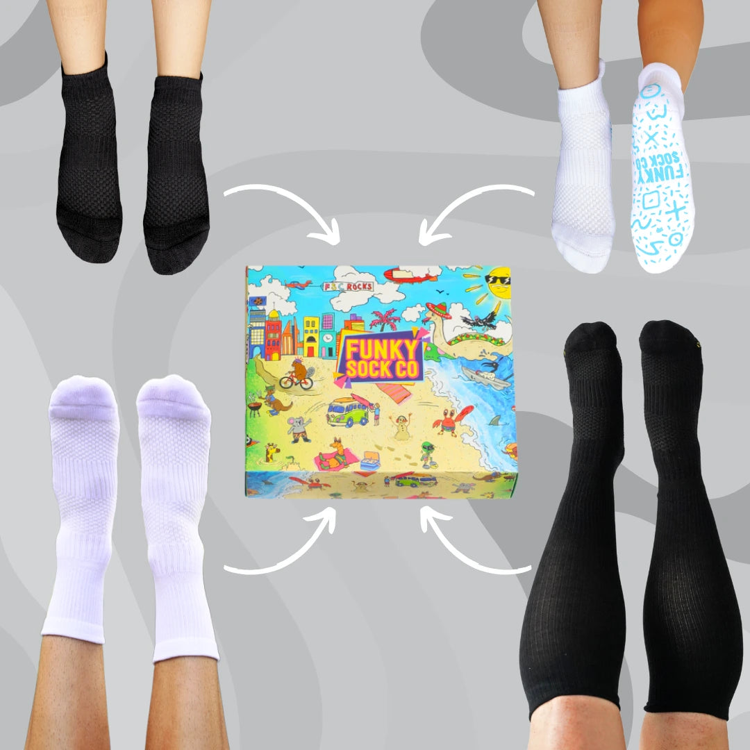 Funky Sock Co Compression Socks are designed for comfort and ease. Featuring two different graduated compression ranges - Classic (20-30mmHg) and Bamboo (12-15mmHg) with sizing up to 7XL in our Classic Range. Our socks provide reliable support to keep your legs feeling energized and comfortable all day.